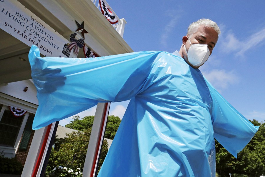 Read moreBrendan Williams, the president of the New Hampshire Health Care Association, wears an isolation gown with no sleeve openings for hands, which was received in a shipment from the federal government, outside the Webster at Rye senior-care center in Rye, New Hampshire, on July 1, 2020. The problematic gowns, child-size examination gloves, and surgical masks with ear loops that break when stretched make up the bulk of the personal protective equipment recently sent by FEMA to New Hampshire nursing homes, according to Williams. The facility is not using the items they received from FEMA. #