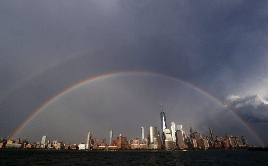 Read moreA double rainbow forms in the sky over Lower Manhattan and One World Trade Center during weekend Pride celebrations in New York City on June 28, 2020, as seen from Jersey City, New Jersey. #