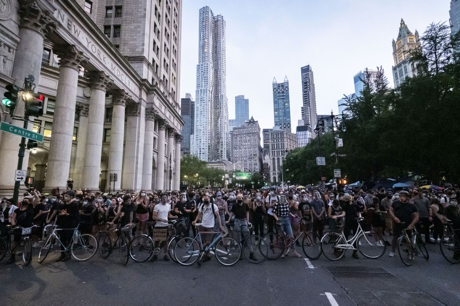 Read moreProtesters barricade a street with bikes and hundreds of people at city hall in Manhattan, part of the Occupy City Hall effort, which has seen protesters camping out for days where the New York City Council was set to vote on the NYPD budget. #