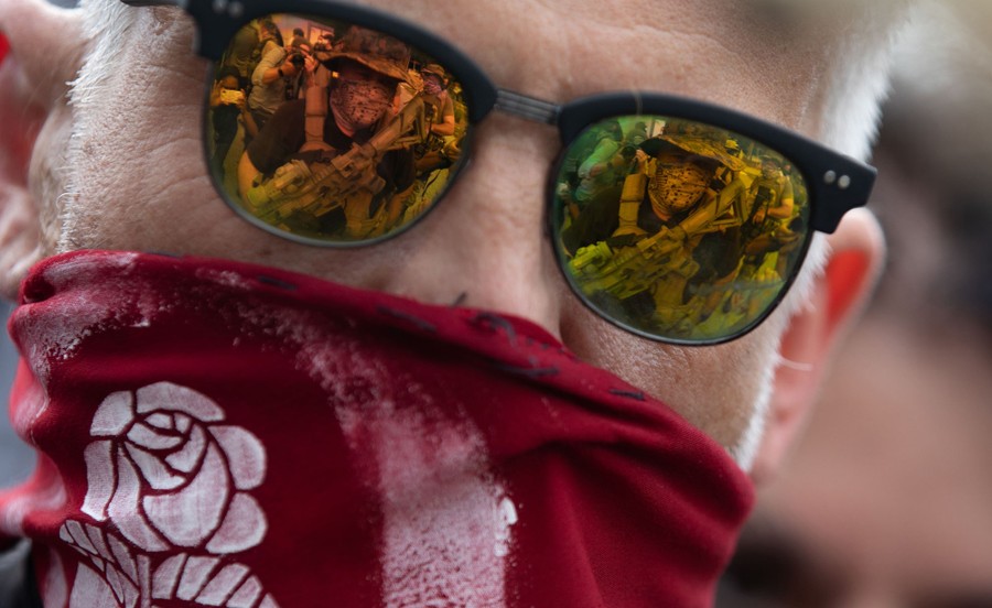 Read moreMembers of far-right militias and white-pride organizations are reflected into the glasses of an anti-fascist protester at a rally near Stone Mountain Park in Stone Mountain, Georgia, on August 15, 2020. Militia members were met with anti-racist and anti-fascist protesters organized by F.L.O.W.E.R., a frontline organization based in Atlanta that combats racism. #