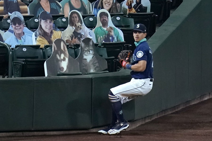 Read moreSeattle Mariners left fielder Sam Haggerty turns back to the field after chasing a foul ball toward the stands, filled with images of fans (and pets), during a baseball game against the Los Angeles Dodgers on August 19, 2020, in Seattle. #