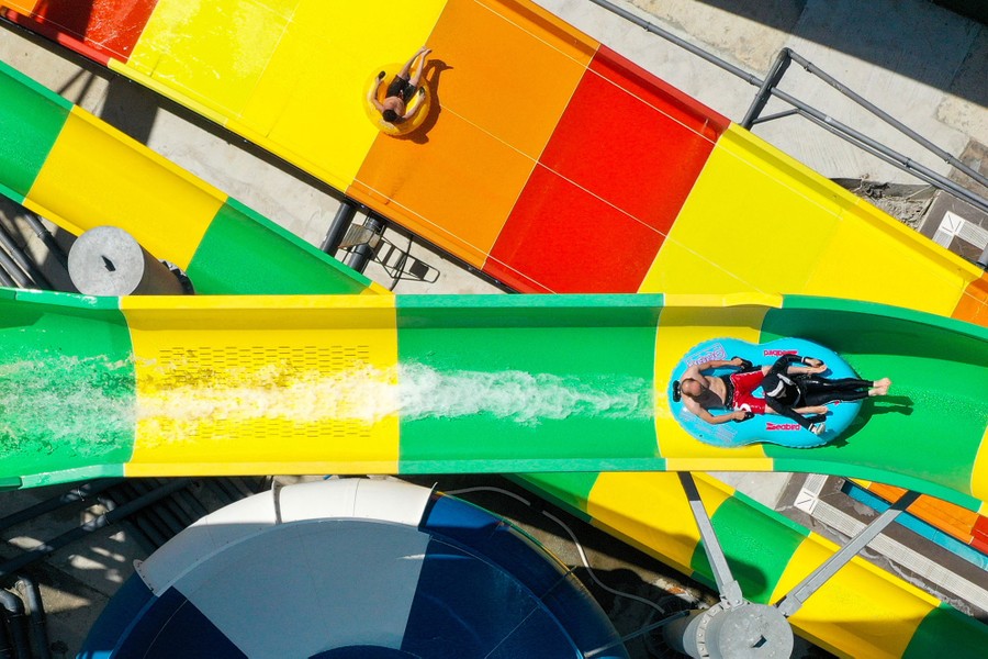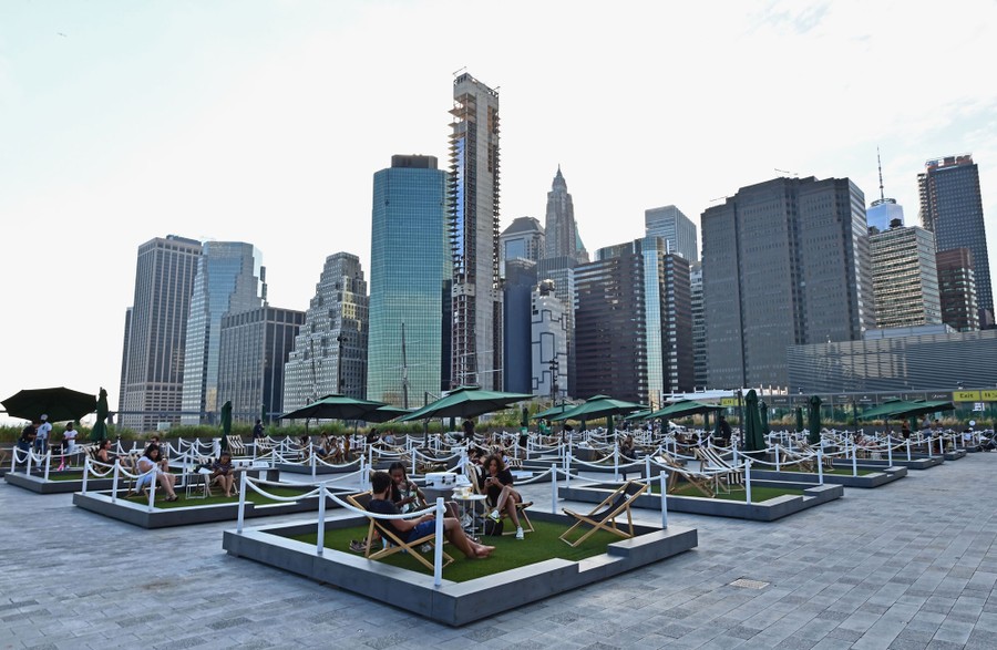 Read morePeople relax on socially distant mini lawns on the rooftop of Pier 17, called "The Greens," on August 14, 2020, in the Seaport District of New York City. The rooftop had to cancel its entire run of concerts and special events this season because of the COVID-19 pandemic. #