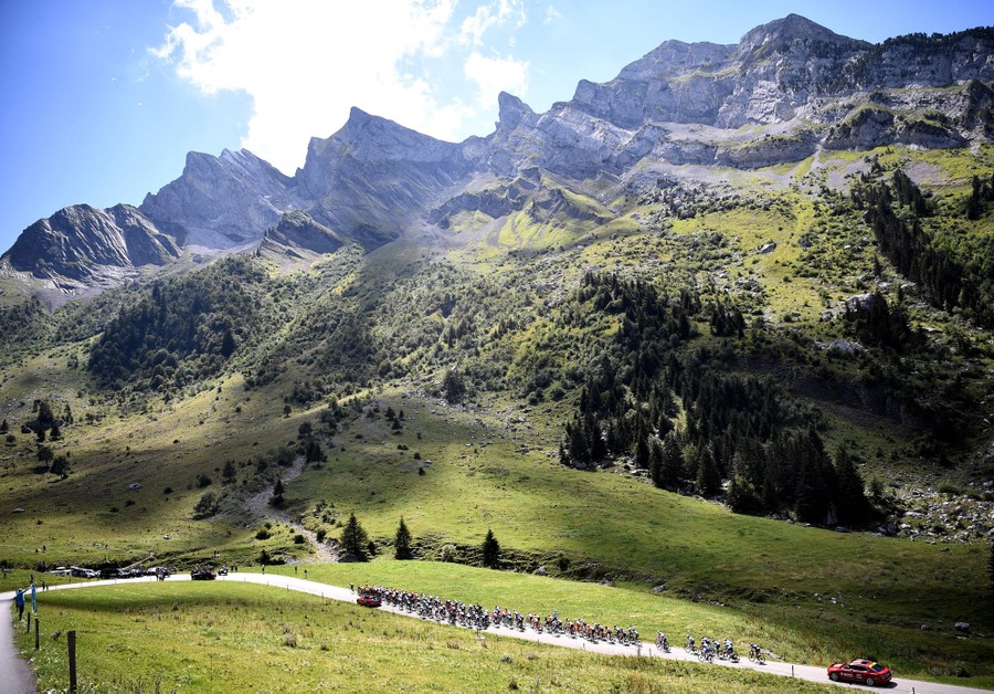 Read moreThe pack of riders climbs during the fourth stage of the 72nd edition of the Criterium du Dauphine cycling race, 153 km between Ugine and Megève, France, on August 15, 2020. #