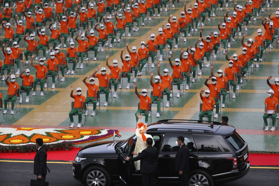 Read moreIndian Prime Minister Narendra Modi, center, waves to members of the National Cadet Corps, a youth wing of the armed forces for school and college students, dressed in the colors of the Indian national flag, as he leaves after giving a speech to the nation from the historic Red Fort monument on Independence Day in New Delhi, India, on August 15, 2020. #
