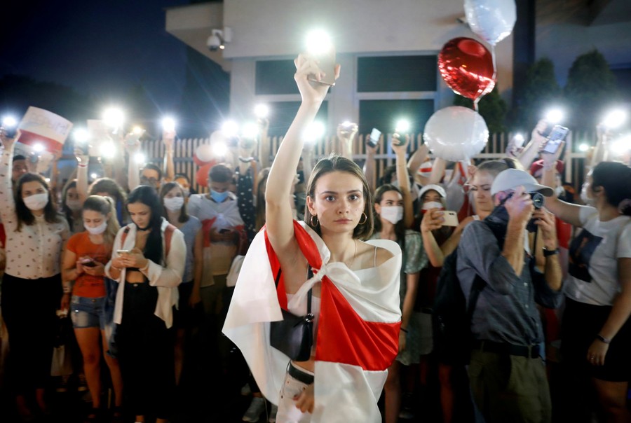 Read moreA demonstrator holds up her phone during a march in solidarity with Belarusian people after the country's disputed presidential election, outside the Belarusian Embassy in Warsaw, Poland, on August 14, 2020. #