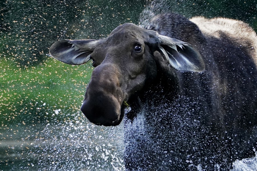 Read moreA cow moose shakes water and a swarm of insects from its fur while feeding in Lobster Stream on August 13, 2020, in Lobster Township, Maine. While summer insects are a nuisance to the animals, winter ticks have killed thousands of moose in New England. #
