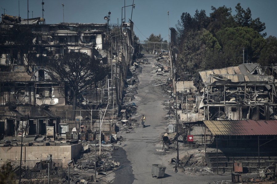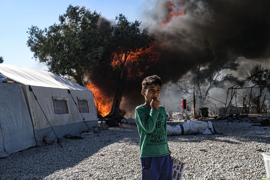 Read moreAn Afghan asylum-seeking boy looks on as fires, which started on Tuesday night, continue to rage into Thursday morning inside of the Moria Refugee Camp on September 10, 2020. According to UNHCR, the number of asylum-seekers displaced from the encampment is around 12,000. #
