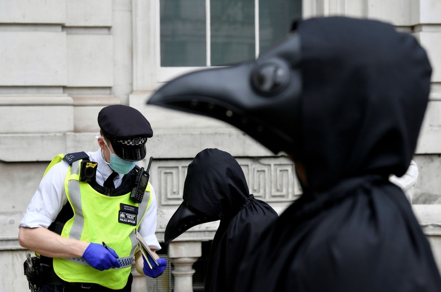 Read moreA police officer takes down the information details of one of the members of the Animal Rebellion group dressed in a costume, as they march during an Extinction Rebellion protest in London, England, September 8, 2020. #