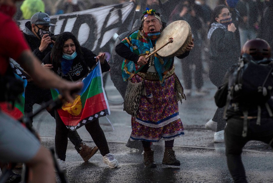 Read moreA Mapuche indigenous woman plays a drum as riot police use water cannons to disperse demonstrators during a protest against the government's handling of the coronavirus pandemic in Santiago, Chile, on September 4, 2020. #