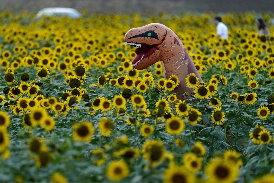 Read moreA person in a T-Rex costume walks through a sunflower field at Grinter Farms, near Lawrence, Kansas, on September 7, 2020. The 26-acre field, planted annually by the Grinter family, draws thousands of visitors during the weeklong late summer blossoming of the flowers. #