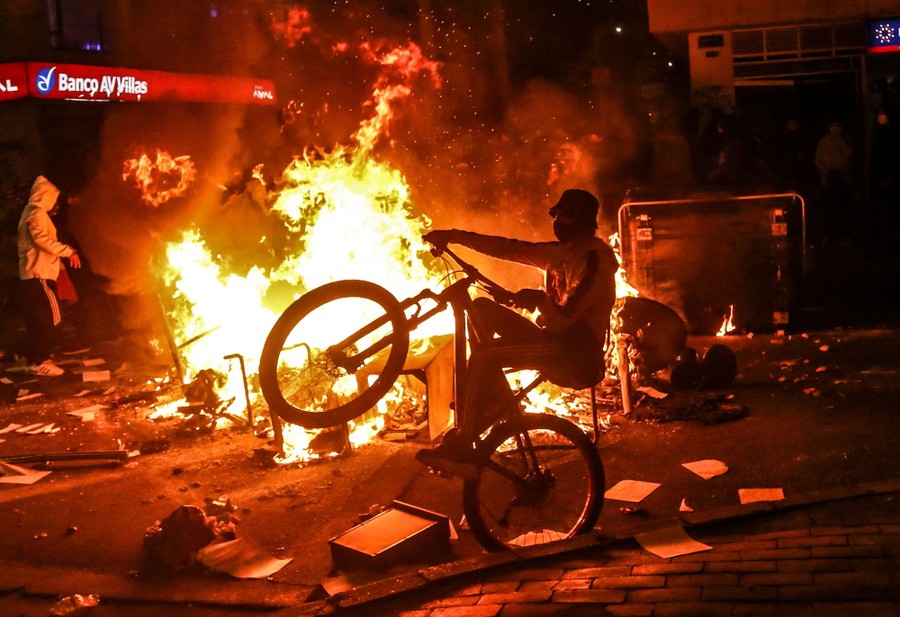 Read moreA demonstrator rides a bike at a barricade set on fire during clashes with riot police that erupted during a protest against the death of a lawyer under police custody, in Bogota, Colombia, early on September 10, 2020. #