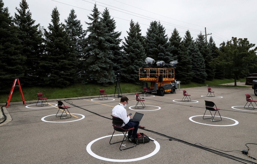 Read moreA journalist works on a story inside a designated socially-distant circle after Democratic U.S. presidential nominee and former Vice President Joe Biden spoke at a campaign event in Warren, Michigan, on September 9, 2020. #