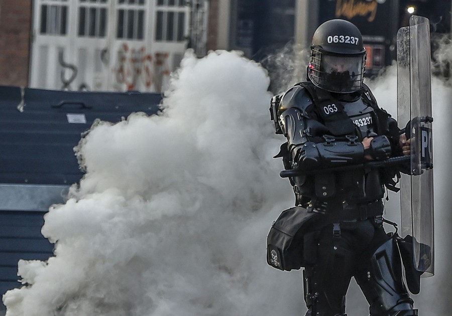 Read moreA riot police officer stands beside a cloud of smoke during a protest against the death of a lawyer under police custody, in Bogota, Colombia, on September 9, 2020. A man who was detained by police officers died Wednesday in Bogota after receiving repeated electric shocks on the ground with a stun gun. #