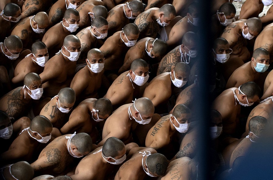 Read moreMembers of the Mara 18 and MS-13 gangs are seen in the custody of guards at a maximum security prison in Izalco, Sonsonate, El Salvador, on September 4, 2020. The Salvadoran government was showing the "strict" living conditions of gang members in the country's prisons, amid a controversy generated by a report that denounced alleged benefits being given to imprisoned gang members to reduce homicides. #