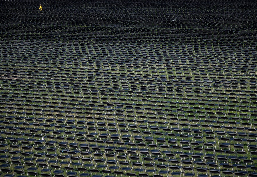 Read moreAn event staff member walks among the empty chairs on display to represent the 200,000 lives lost to COVID-19 at the National COVID-19 Remembrance, on the ellipse behind the White House, in Washington, D.C., on October 4, 2020. #
