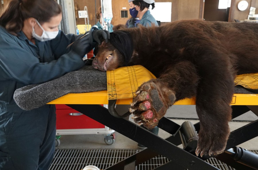 Read moreCalifornia Department of Fish and Wildlife staff members evaluate a bear being treated for burns suffered in the Bear Fire in Butte County, at the Wildlife Investigations Lab on September 21, 2020. #