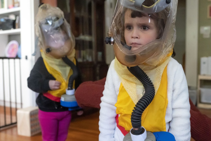Read moreBuddy Mae Walker, 4, looks at herself in the mirror while trying on a child respirator provided by the nonprofit TeamRaccoonPDX on October 6, 2020, in Portland, Oregon. "We told them their grandparents sent them spacesuits to keep them safe," their mother, Jessica Walker, said of the respirators, which the family sought out after police used tear gas near their residential street. #