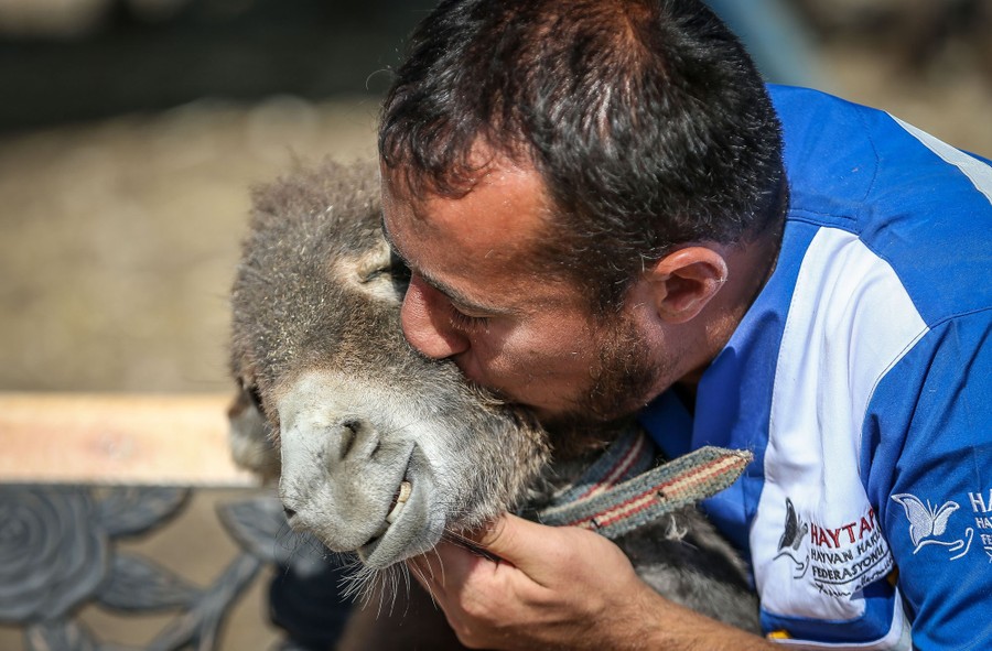 Read moreA worker caresses a donkey at the Retired Animals Farm in Bursa, Turkey, on October 1, 2020. The Animal Rights Federation established the farm for animals that were tortured, thrown out by their owners, injured, or in need of assistance. The farm provides a home to horses, donkeys, cows, sheep, and chickens from all around the country. #