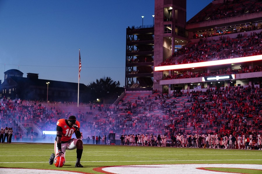 Read moreThe University of Georgia defensive lineman Malik Herring kneels on the field before an NCAA college football game against Auburn on October 3, 2020, in Athens, Georgia. #