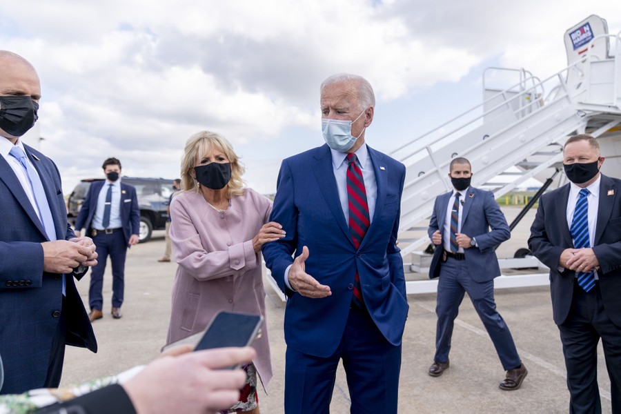 Read moreJill Biden pulls back her husband, the Democratic presidential candidate and former Vice President Joe Biden, distancing him from members of the media as he speaks outside his campaign plane at New Castle Airport in New Castle, Delaware, on October 5, 2020. #