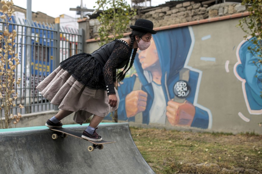 Read moreA woman wearing the traditional clothes of a "cholita" skates during a skate festival in La Paz, Bolivia, on September 30, 2020. These young women wear this traditional clothing as a statement of their pride in indigenous culture. #