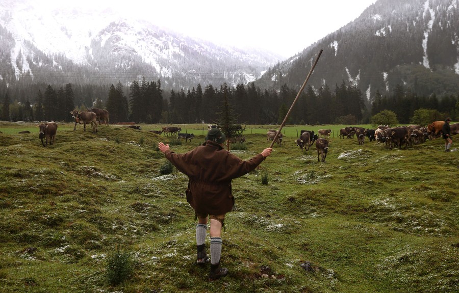 Read moreCattle herders dressed in traditional Bavarian clothing guide cows down from their summer mountain pasture during the annual end-of-summer cattle drive near Bad Hindelang, Germany, on September 26, 2020. #