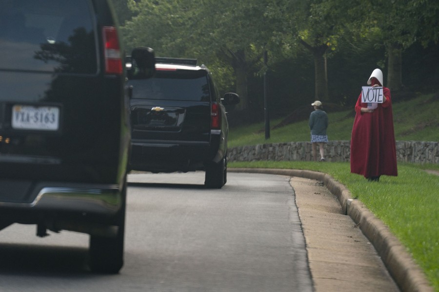 Read moreA protester holds a sign that says "VOTE" as President Donald Trump's motorcade passes, en route to Trump National Golf Club in Sterling, Virginia, on September 27, 2020. #