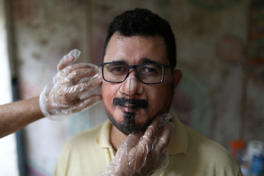 Read moreWescley Menezes receives help from the artist Jorge Silva Roriz to adjust his customized protective mask, amid the coronavirus outbreak in Rio de Janeiro, Brazil, on November 10, 2020. #