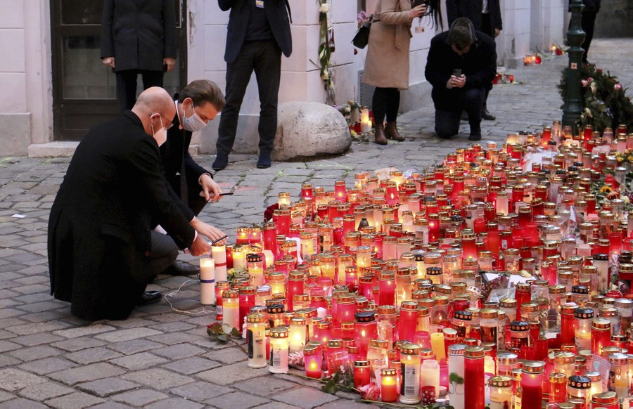 Read moreCharles Michel, president of the European Council (left), and Austrian Chancellor Sebastian Kurz place candle tributes to those killed as they commemorate the terror attack one week ago in Vienna, Austria, on November 9, 2020. On November 2, an attacker opened fire in the city center, killing four and injuring 23 others, before being shot and killed by police. #