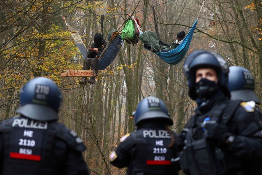 Read morePolice officers are seen as demonstrators lie in hammocks hanging from trees during a protest against the extension of the A49 motorway, in a forest near Stadtallendorf, Germany, on November 11, 2020. #