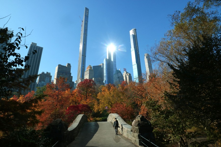 Read moreA woman walks over the Gapstow Bridge in Central Park in front of the Steinway Tower, One 57, and Central Park Tower on Billionaires' Row on November 9, 2020, in New York City. #