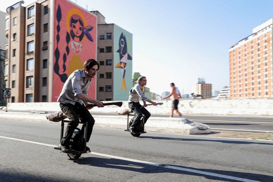 Read moreFriends Vinicius Sanctus and Alessandro Russo ride modified electric unicycles, fitted with devices called "nuvem" that they invented, inspired by the magic flying brooms of the Harry Potter series, in Sao Paulo, Brazil, on November 7, 2020. #