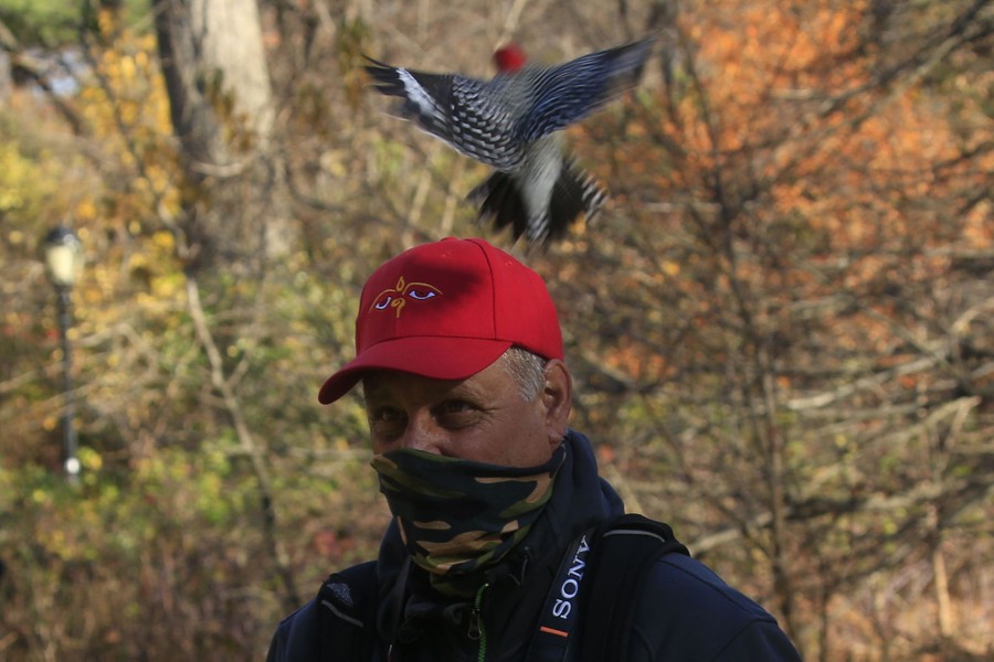 Read moreRobert DeCandido, also known as "Birding Bob," is attacked by a red-bellied woodpecker as he leads a group of bird watchers during a tour in Central Park, New York City on November 29, 2020. #