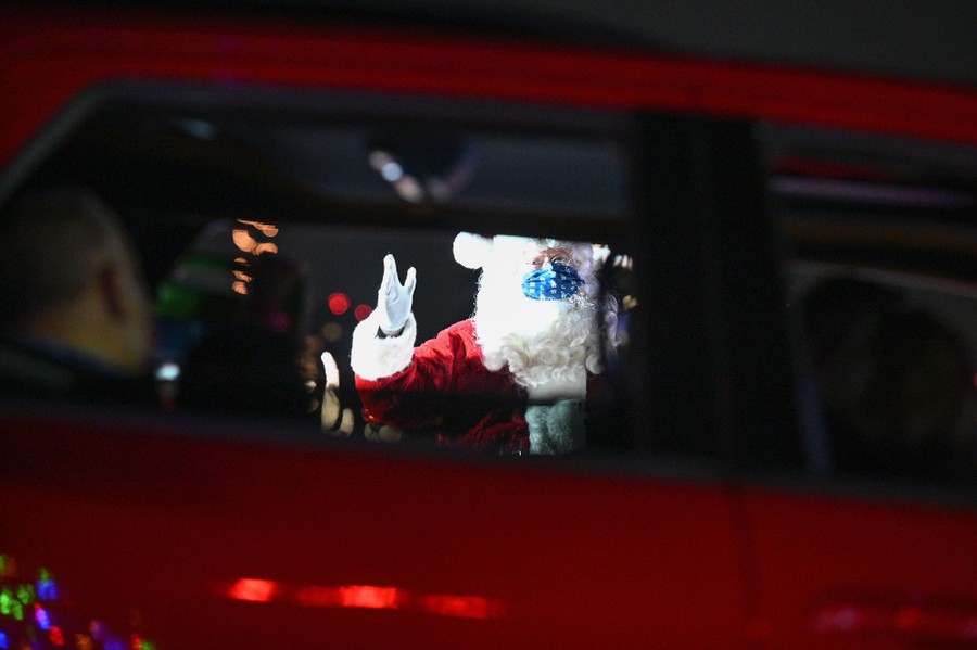 Read moreSanta Claus gestures to visitors in their cars as they attend the Dodgers Holiday Festival, a drive-through light and performance experience honoring the Dodgers's baseball World Championship and celebrating the holiday season in a safe way, on December 2, 2020, at Dodgers Stadium in Los Angeles, California. #