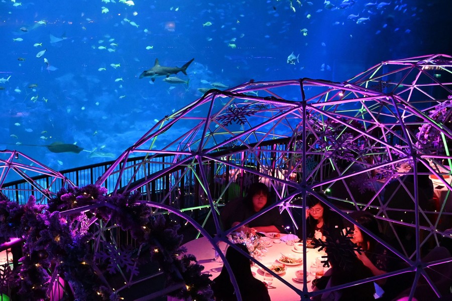 Read moreDiners eat in pods set up for the pop-up restaurant, Aqua Gastronomy, inside Resorts World Sentosa's S.E.A. Aquarium, which operates in the evening, after the aquarium's visiting hours, in Singapore, on December 3, 2020. #