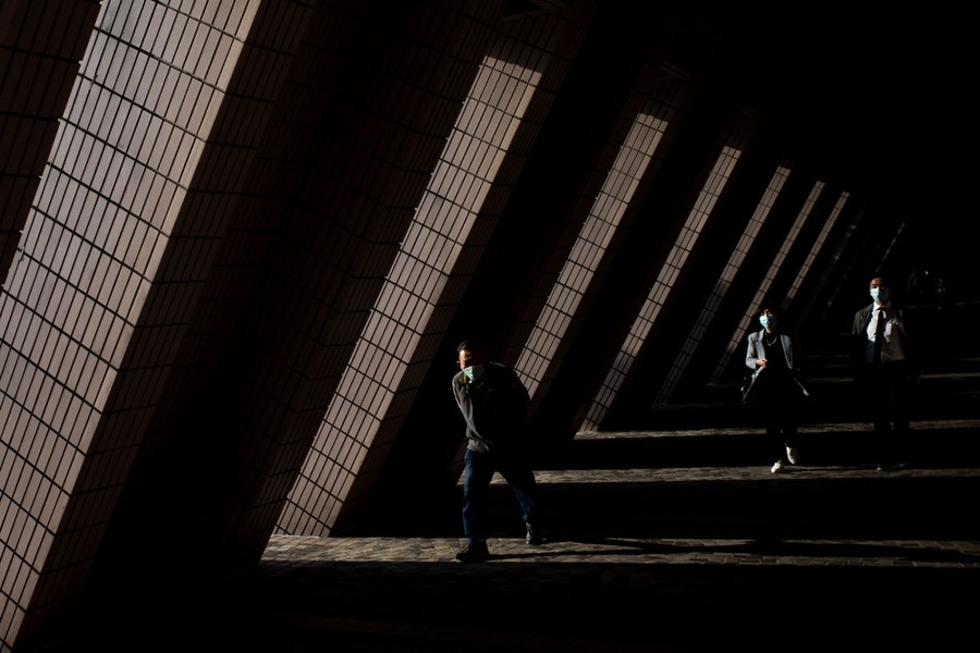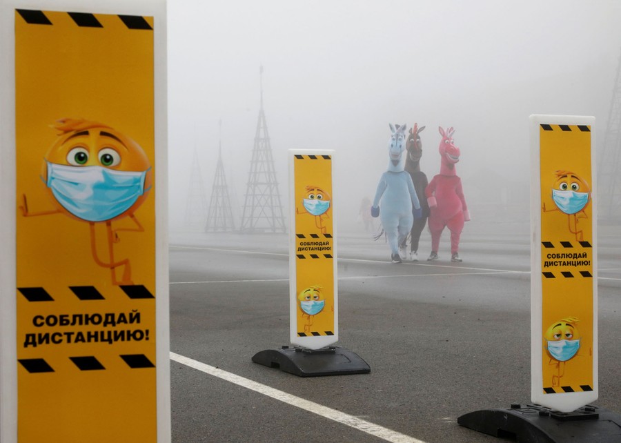 Read morePeople wearing animal costumes walk near a skating rink past signs requesting the use of protective face masks, as heavy fog covers a square named after the Soviet state founder, Vladimir Lenin, in Stavropol, Russia, on December 1, 2020. #