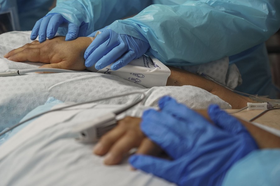 Read moreMedical staff members palpate a patient who is on a rotating medical bed in the COVID-19 intensive-care unit at the United Memorial Medical Center on December 2, 2020, in Houston, Texas. #