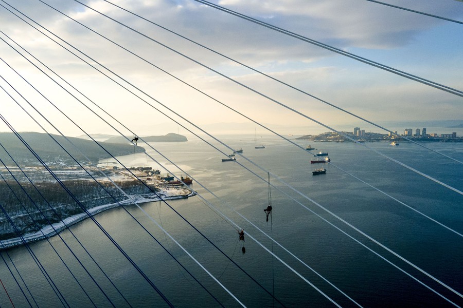 Read moreIndustrial climbers remove ice from the cables of the Russky Bridge across the Eastern Bosphorus Strait in Vladivostok, Russia, on November 30, 2020. The bridge was temporarily closed after an ice storm, with a ferry service launched between Russky Island and mainland Vladivostok. #