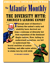 Just one month earlier, in "The Diversity Myth: America's Leading Export" (May 1995), Benjamin Schwarz offered Atlantic readers a bold explanation of why the effort "to remake the world in our image" is not only vain but most likely destined to fail. In essence, Schwarz writes, the problem is that America's foreign-policy experts, and thus the politicians they advise, cling to an idealized view of American history as a triumph of pluralism and ethnic diversity. And yet this is simply not the case, Schwarz tells us. "We get the world wrong," he argues, "because we get ourselves wrong. Taken without illusion, our history gives us no right to preach." He goes on to say,