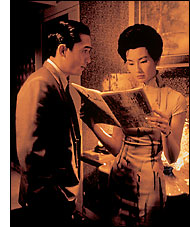 On the principle that the best love stories are sustained by unfulfilled or secret desire, the Hong Kong director Wong Kar-wai (best known in the United States for his whimsical 1994 comedy, Chungking Express) has spent a prolific career obsessively revisiting the theme while crafting a dazzling fusion of cinematic styles from both sides of the Pacific. Set in Hong Kong in 1962, his latest film, In the Mood for Love (billed as a sequel to his 1991 film, Days of Being Wild, and boasting the same two romantic leads), turns on two neighbors in a crowded rooming house who, after discovering that their spouses are having an affair—with each other—struggle with their own growing mutual attraction. Coifed to the gills en bouffant and graceful as a swan in a series of to-die-for high-necked, form-fitting shifts, the Hong Kong martial arts star Maggie Cheung is ravishing but droopy as the lonely wife who finds solace with her equally proper neighbor (Hong Kong heartthrob Tony Leung). The aching beauty of the movie's visual style and its impishly anachronistic score are woefully undercut by the flat affect that courses sluggishly between the would-be lovers, on whom Wong Kar-wai's characteristically voyeuristic and claustrophobic camera spies, framing them in doorways and lintels or disappearing around corners. Though not unduly lengthy by current standards, In the Mood for Love feels like one of the longest brief encounters in cinema history—all mood and precious