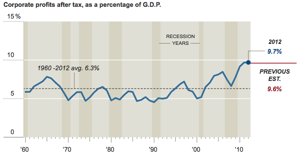 Go back to 1960, and corporate profits have never been higher while salary income has never been lower, as a share of GDP. Take a look here (graph via Floyd Norris):