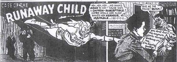 Later, the company introduced a comic strip character named Mr. Coffee Nerves, who deviously disrupted his victims' lives by making them irritable and jittery (or causing indigestion). The maddening grip of the coffee bean was so strong, apparently, that it could convince a child to up and run away from home. The ads always wrapped up with a happy ending after the hapless coffee drinker had, of course, switched to Postum.