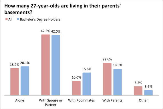 Among all of today's 27 year olds, 28.2 percent were married in 2012 and 30.9 percent were living with a significant other. The majority of bachelor's degree holders, however, reported they were still single. (To clarify: that just means neither married nor cohabitating. I'm sure plenty were in relationships).