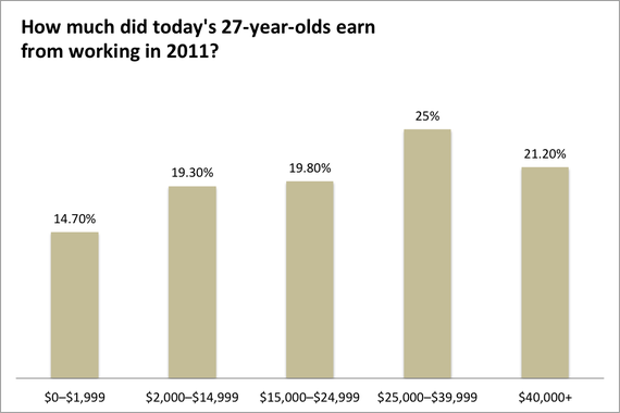 In 2011, today's 27-year-olds were more likely to be earning less than $15,000 a year from work than they were to be earning more than $40,000.