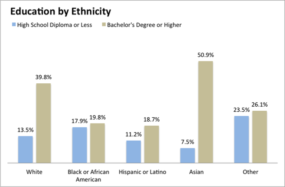 2. Asians are far more likely to have a bachelor's degree than blacks, Hispanics, or whites.