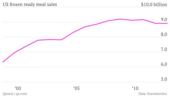 But TV dinners are losing their ubiquity. Just ask Nestlé, which is struggling with its Lean Cuisine frozen food line. The food giant is even considering unloading its $400-million frozen foods business entirely. And with good reason. After nearly 60 years of sustained growth, frozen ready meal sales have finally started to dip. Since 2008, they have either fallen or come in just about flat.