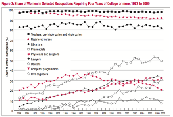 Instead, there's yet another trend behind the wage gap. It could be that not enough women are taking "male" jobs—things like construction, computer programming, and civil engineering (none of which require anything particularly manly to succeed). Women, meanwhile, tend to disproportionately become kindergarten teachers and registered nurses. This chart from IWPR shows how pronounced this division can be: