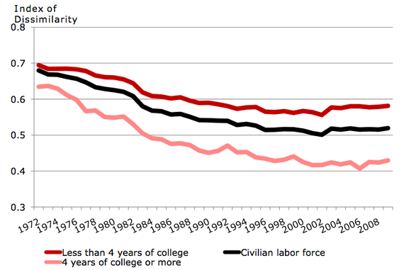 Now, within the FERB, there is also this idea called the "Index of Dissimilarity." It basically just shows how many women would need to change fields in order to make all workplaces in America have about a 50/50 gender split. The Index had been decreasing steadily since the 1970s—more women have been joining traditionally male professions—but since 2000, it has stagnated.