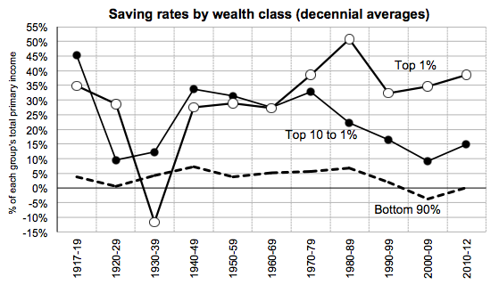 In the last 30 years, the savings rate of "the rest" has fallen from 6 percent to negative-4 percent. It now hovers a whisker away from zero. The rich are different. They save. And the really rich really save, even more than they used to, according to a new paper from economists Gabriel Zucman and Emmanuel Saez.