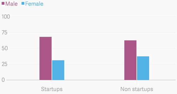 The greater technology intensity of startups shows up in the gender breakdown–there are substantially more men than women in both cases, but it's particularly true for startups.